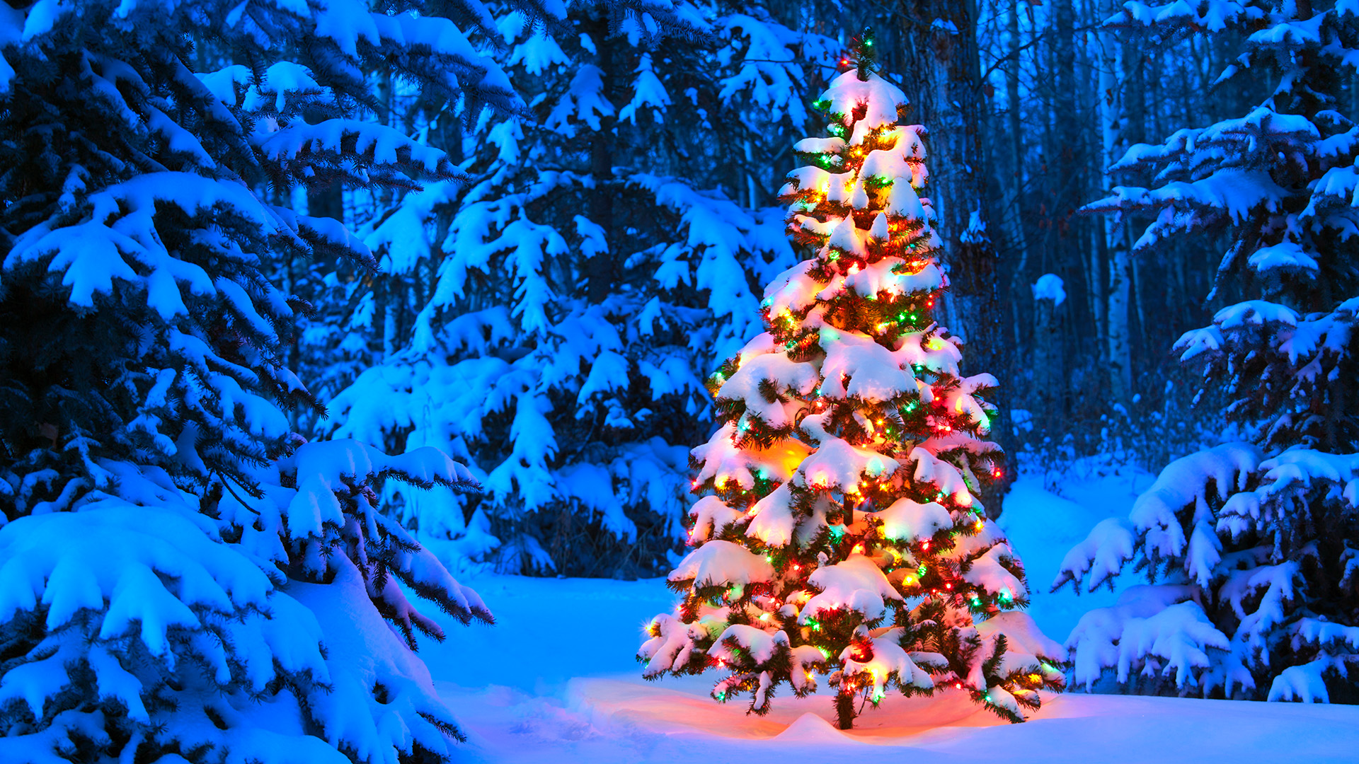 Christmas tree glowing outdoors in the forest at dusk