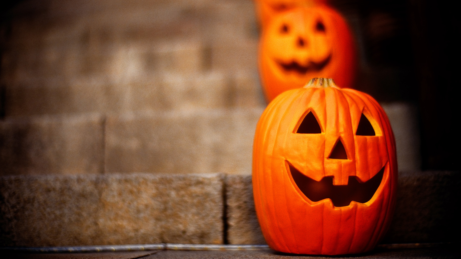 Face carved pumpkins Jack O' Lantern in row on steps during Halloween, Kobe, Japan