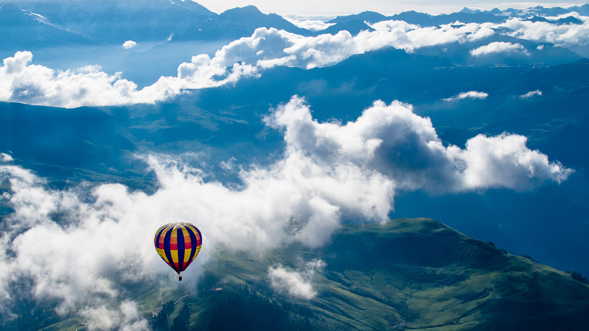 Hot air balloon over the Alps, Praz-sur-Arly, Haute-Savoie, Auvergne-Rhône-Alpes, France