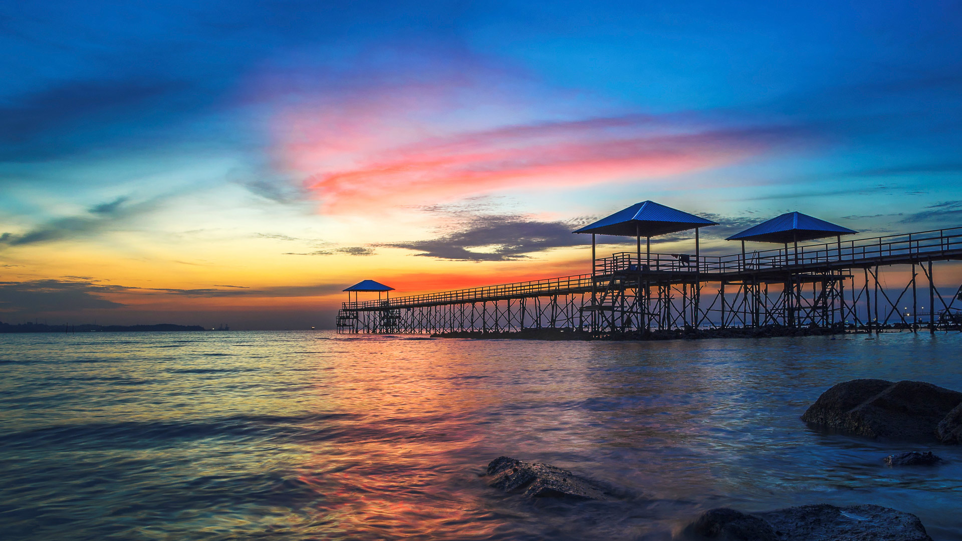 Sunset over jetty, Nongsa Beach, Montigo Resorts, Batam, Riau Islands, Indonesia