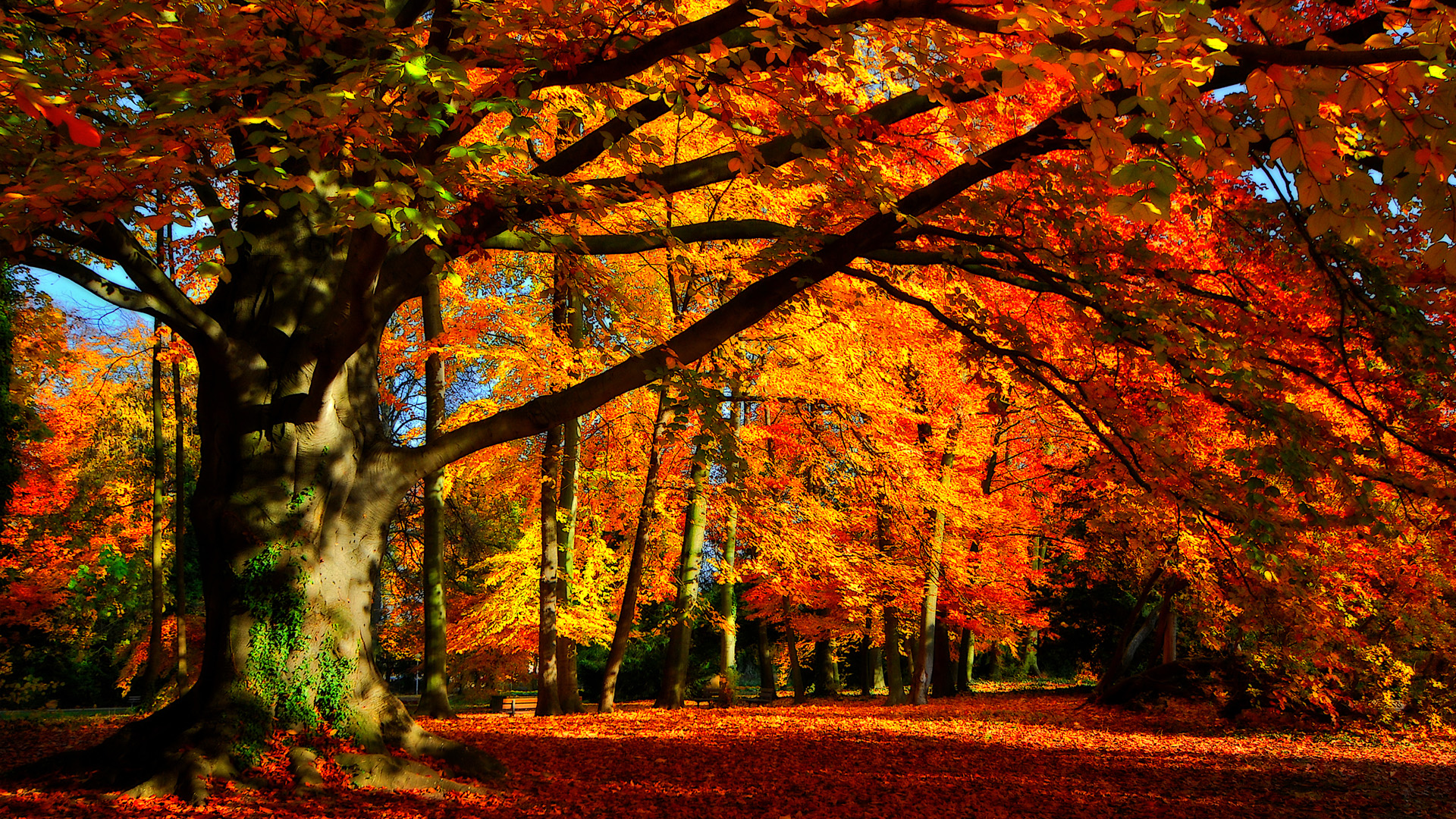 The red trees of a forest in autumn, Strasbourg, Alsace, France